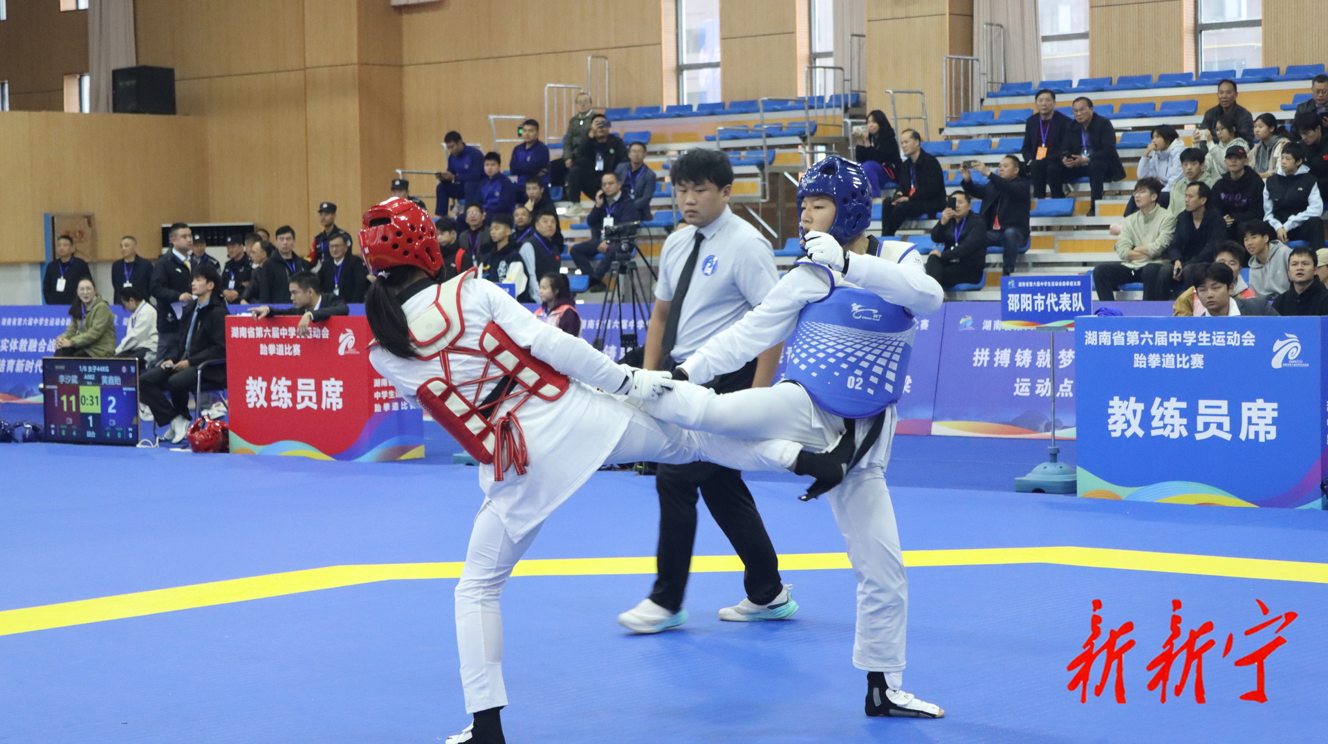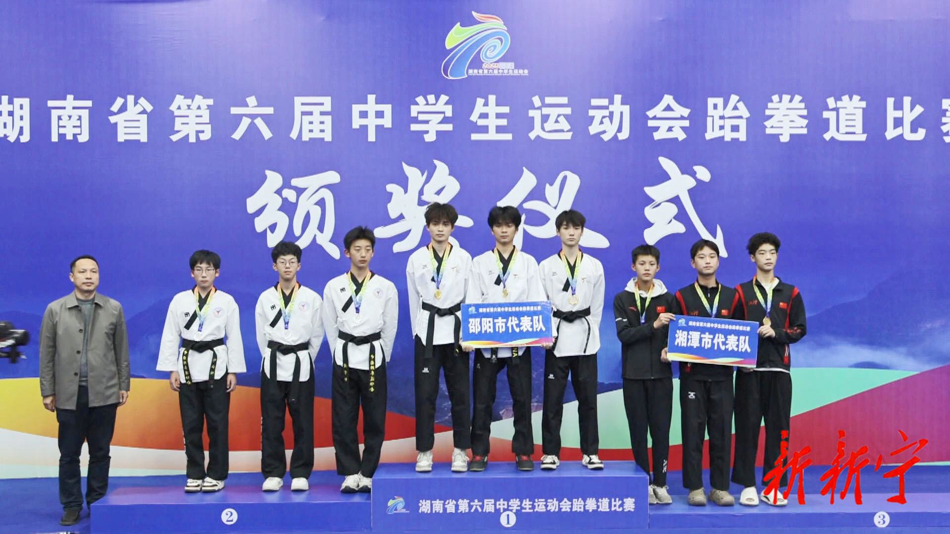 10月22日,湖南省第六届中学生运动会跆拳道比赛在新宁开赛,比赛首日,邵阳代表队表现抢眼,凭借稳定发挥与凌厉攻势,为邵阳代表团斩获三枚金牌。市教育局副局长陈代林,副县长唐基俊分别为获奖团队颁奖。