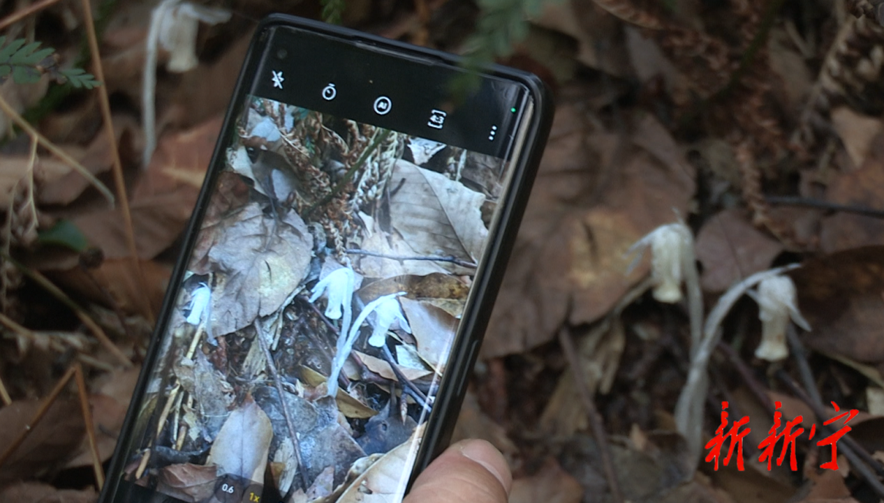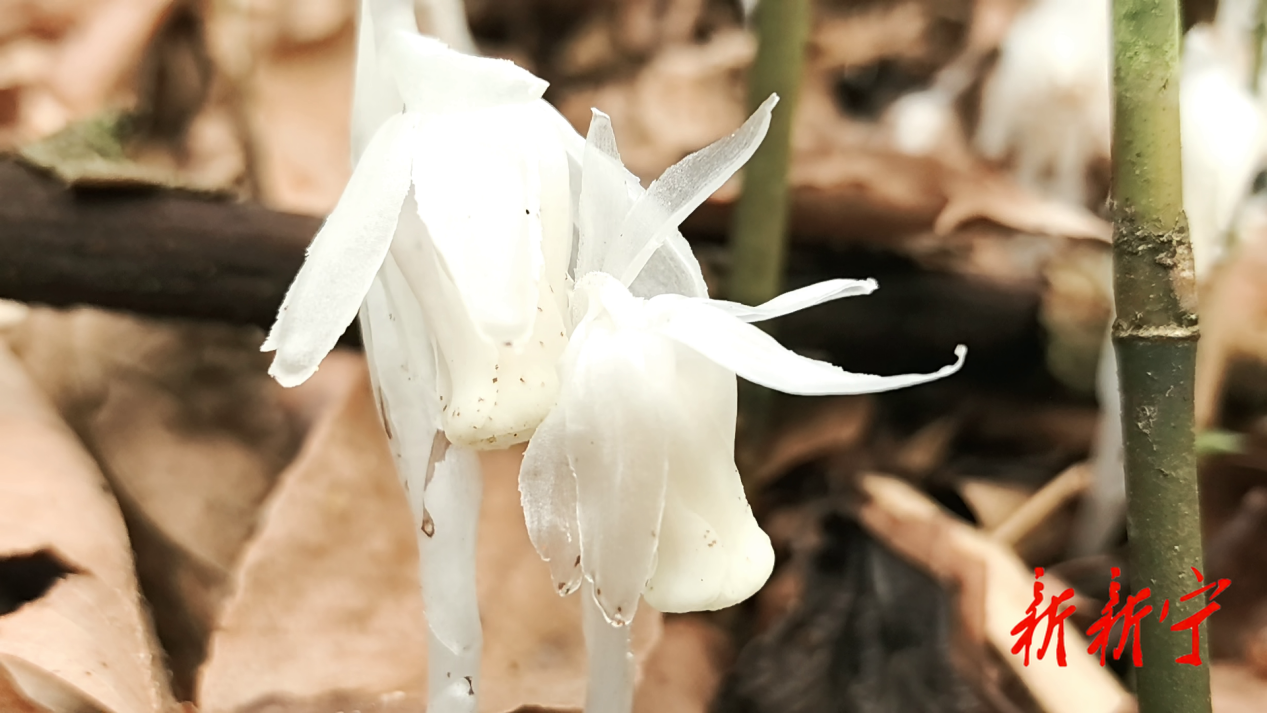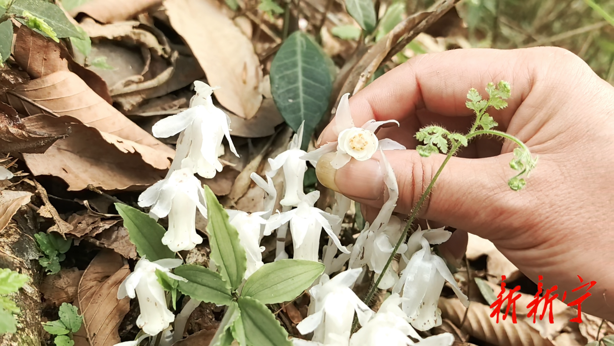 紫云山保护站副站长 杨剑清:我们首次发现这么一大片水晶兰,它的花头完全垂直向下,花蕊是金黄色的,我们感到特别惊喜!后续我们会全力守护好这些珍稀植物。