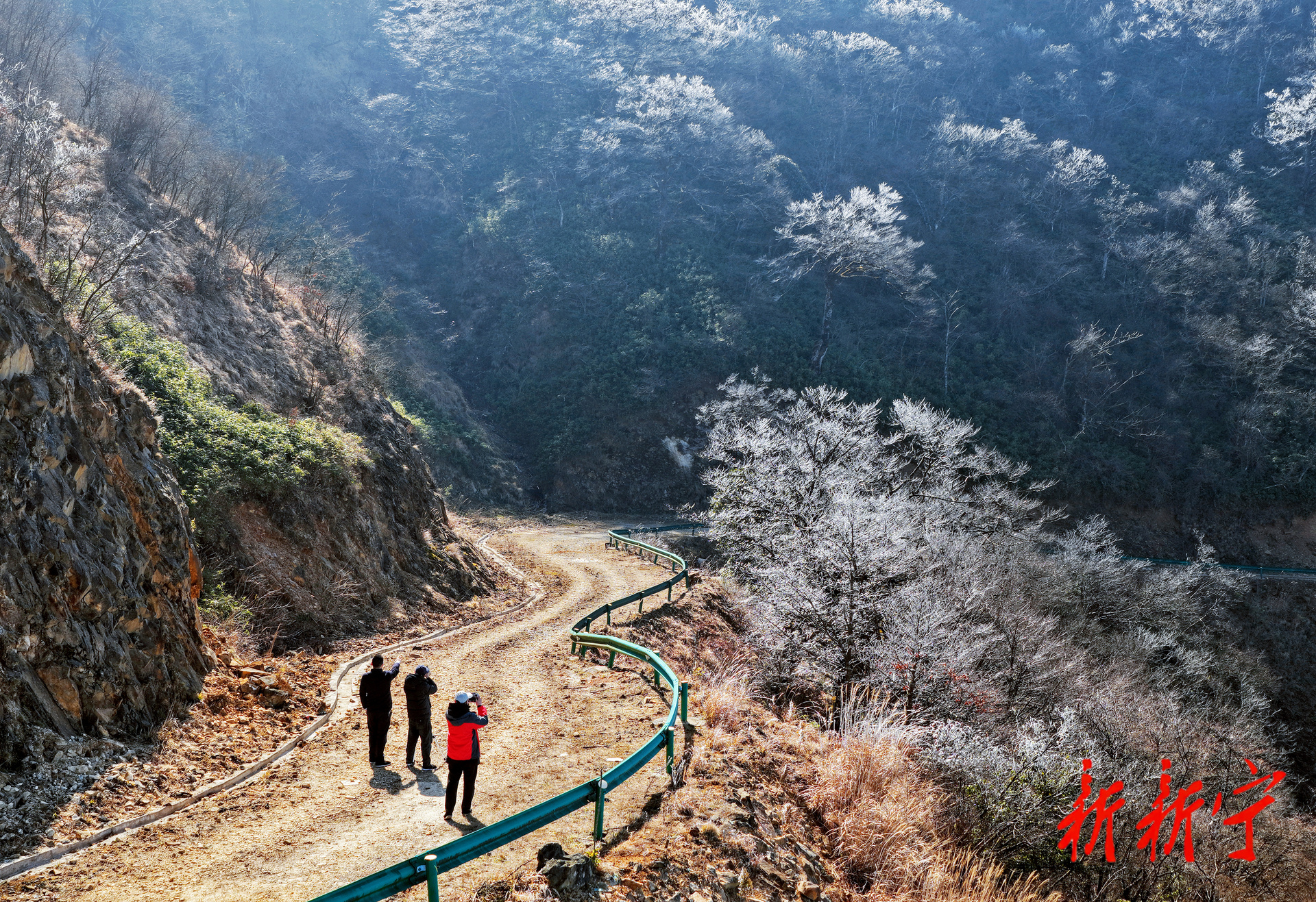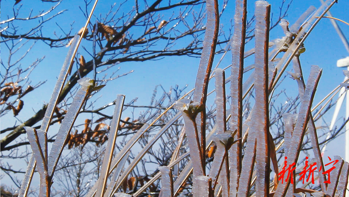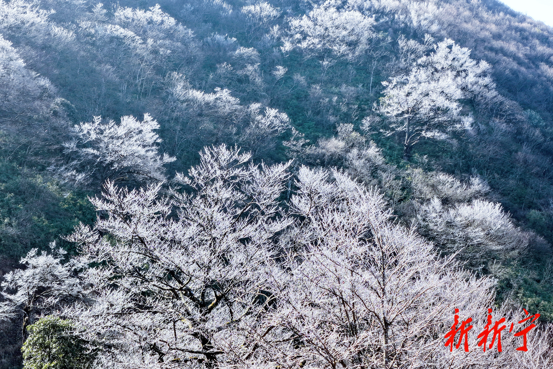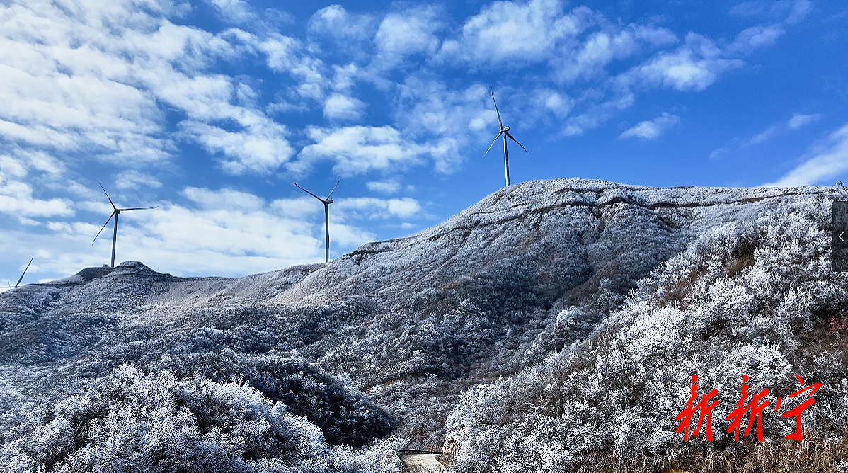 随着气温缓慢回升,阳光洒落,冰晶折射出璀璨光芒,在蓝天白云的映衬下,银装素裹的山野尽显灵动,正应了“千树万树梨花开”的诗意景致。
